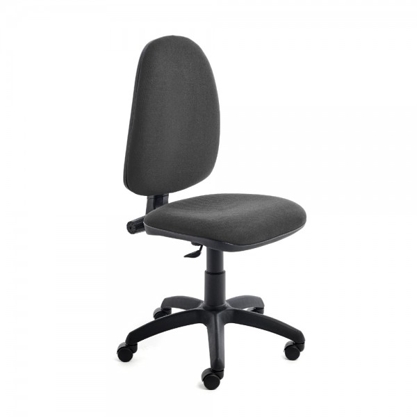 Silla operativa de oficina con mecanismo de regulación de respaldo mediante contacto permanente. Elevación en altura mediante cilindro de gas. Base giratoria con 5 ruedas. Tapizada en tela ignífuga.