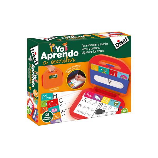 Maletín luminoso educativo con el que el niño podrá practicar sus primeros trazos para aprender a escribir las primeras letras del abecedario en mayúsculas y minúsculas y algunas palabras de forma sencilla y divertida. El juego consta de 21 láminas de dificultad progresiva que se pueden borrar y así el niño puede practicar tantas veces como quiera y sin darse cuenta aprenderá jugando y pasándolo en grande. Gracias a la base con luz que tiene el maletín, que sirve como sistema autocorrectivo, el niño podrá comprobar si está realizando el trazo correcto. El pupitre-maletín convierte este juguete en un producto ideal para guardar las láminas en su propio compartimento, transportarlo y dibujar sobre.